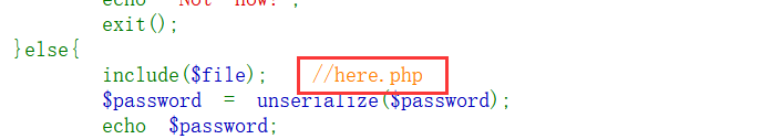 如果file没有匹配到flag,那就会进入else,通过包含here.php这个文件,生成一个Flag类的对象,就可以让password得到这个参数,之后反序列化得到flag